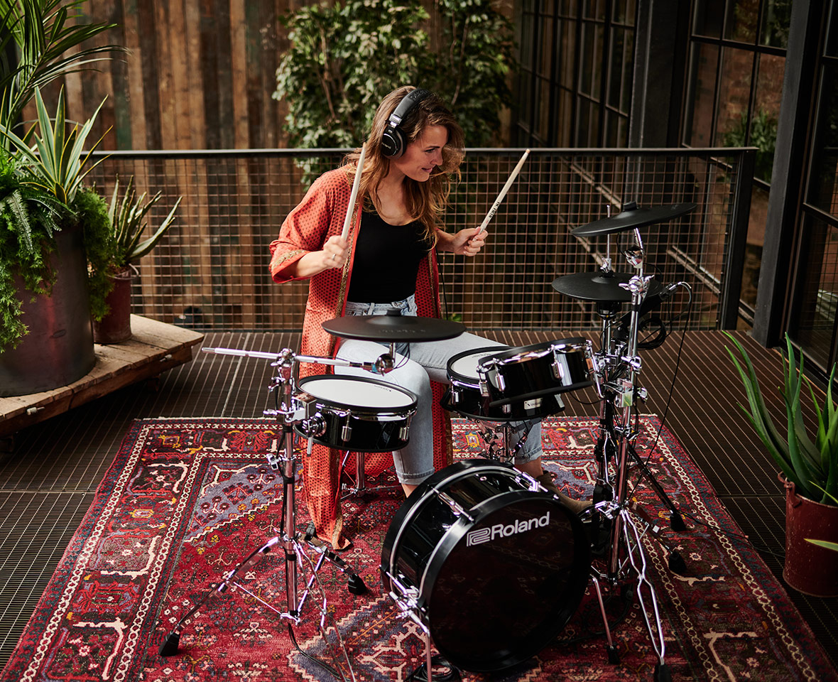 - Snare and tom pads with Roland’s legendary double-ply, tension-adjustable mesh drumheads