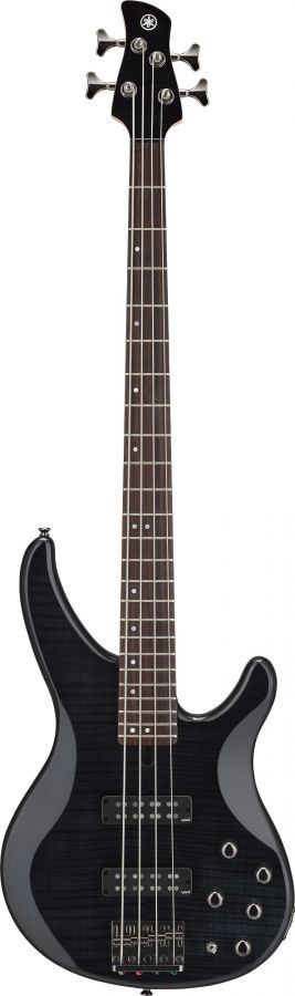 The translucent black TRBX604FM 4-String Electric Bass Guitar from Yamaha is a solid-body electric bass instrument with a double-cutaway 3D design, a body constructed from alder/maple wood, and a flame maple top. It is built with 24 frets, a rosewood fingerboard, 34″ scale length, a die-cast bridge, covered die-cast tuners, and equipped with a slim 38mm nut width.
